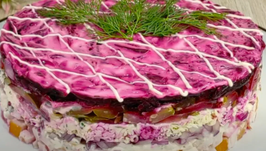 Салат червоний шарм — це шарований салат-торт із копченим курячим філе, буряком та плавленим сиром. Такий буряковий салат завжди зникає першим на святковому