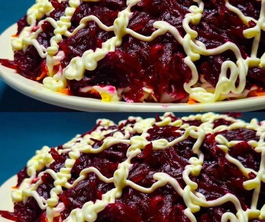 - Буряк — фінальний шар, теж злегка змастити майонезом.