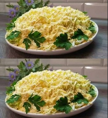 Капусту шаткую, викладаю на салат, поливаю майонезом. На останній шар салату натираю твердий сир на терці, прикрашаю зеленню!
