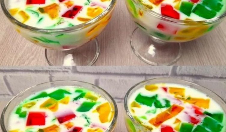 Яскраві шматочки желе, залиті ніжною молочною масою, виглядають ефектно, а смак