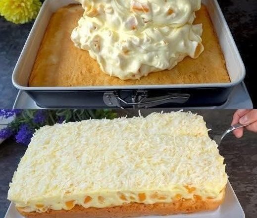 Охолоджений бісквіт розріжте горизонтально на два шари. Намажте нижній шар половиною крему, потім зверху викладіть часточки мандаринів. Накрийте другим шаром і зверху розподіліть решту крему.