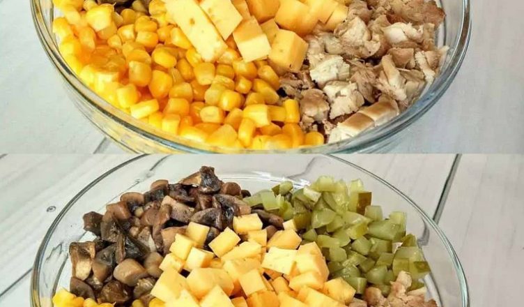 Відварене м’ясо, твердий сир та мариновані огірки нарізаю квадратиками. Всипаю консервовану кукурудзу.