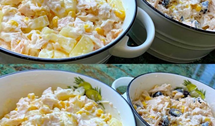 Курку та ананаси нарізаю дрібними кубиками. Всипаю кукурудзу, додаю сіль та майонез або сметану, замішую.