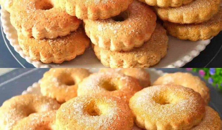 Тісто розкачую у пласт, нарізаю кружечки. Викладаю на форму для випікання застелену пергаментом. Роблю по середині печива менші дірочки. Посипаю цукром. Випікаю у розігрітій духовці при 180°C протягом 13-15 хвилин.