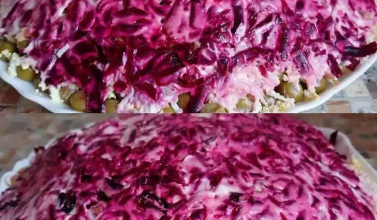 Останній шар — буряк. Беру варений буряк, натираю на терці й розподіляємо зверху. Змащую майонезом, щоб завершити салат. Залишаю його настоятися в холодильнику пару годин — тоді смак розкриється повністю, і можна подавати на стіл.