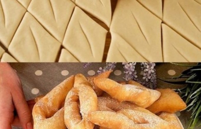 • Наріжте тісто на прямокутники та зробіть проріз у центрі кожного прямокутника. Протягніть один край тіста через проріз, щоб отримати класичну форму хмизу.
