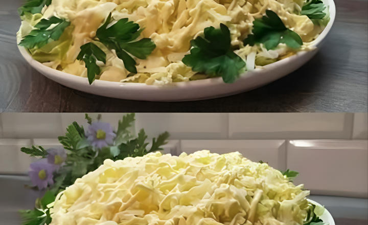 Капусту шаткую, викладаю на салат, поливаю майонезом. На останній шар салату натираю твердий сир на терці, прикрашаю зеленню!