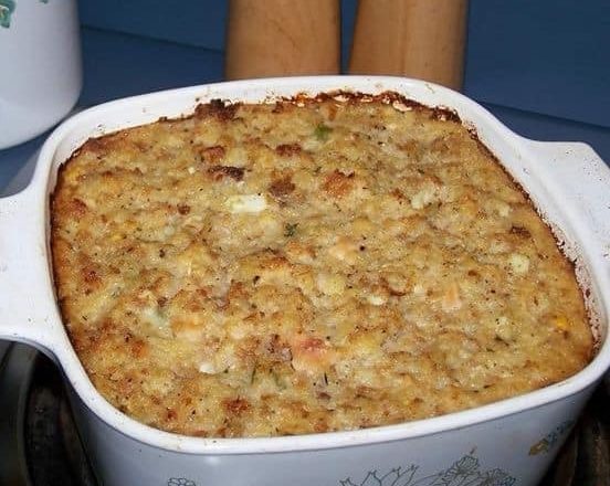 Розтопіть масло на сковороді на середньому вогні. 4 Обсмажте цибулю та селеру до розм’якшення (5–7 хв). 5 Додайте до кукурудзяного хліба. 6. Змішайте курячий бульйон, яйця, шавлію, сіль,