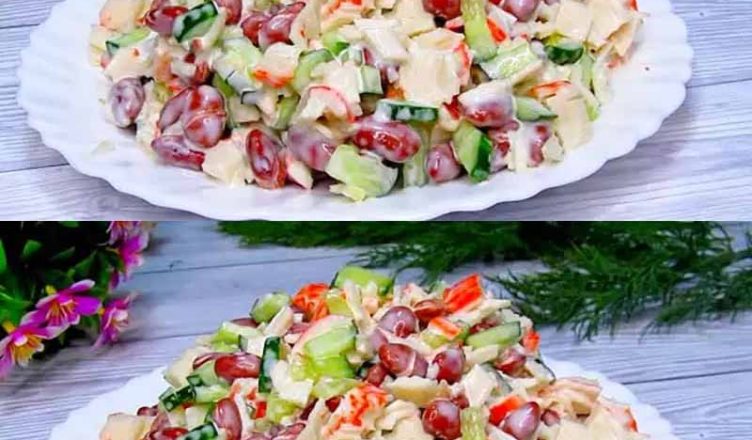 Огірок, крабові палички нарізаю кубиками. Всипаю квасолю, часник натираю на терці.