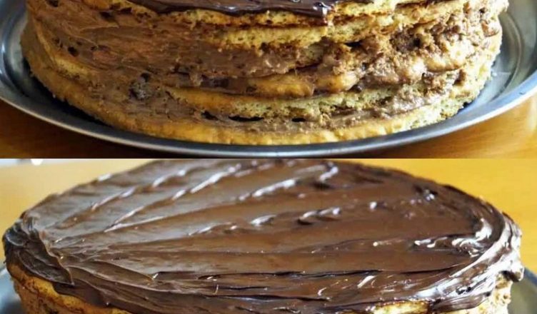 Збираю тортик, змащую усі коржики кремом. Прикрашаю розтопленим шоколадом, смачного!