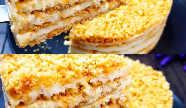 Формую тортик в круглій формі. Насипаю в неї перший шар крихти, крем перекладаю в кондитерський пакет та викладаю другим шаром. Так чергуючи, складаючи торт, у мене вийшло 5 шарів крихти. Останнім шаром буде крихта. Накриваю харчовою плівкою і кладу торт в холодильник на ніч. Смачного!