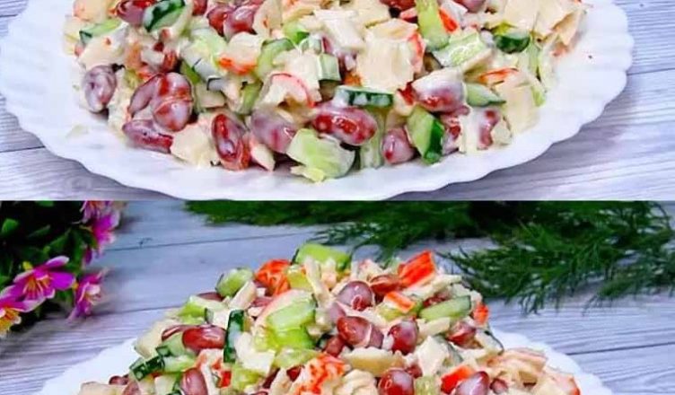 Огірок, крабові палички нарізаю кубиками. Всипаю квасолю, часник натираю на терці.