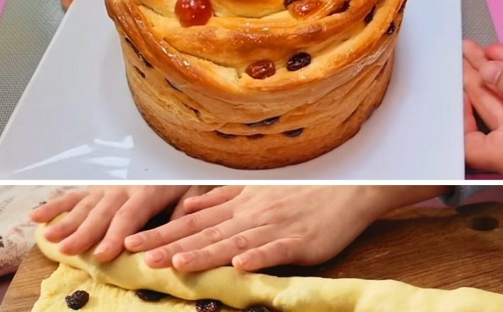 9. Розріжте рулет гострим ножем уздовж навпіл, потім закрутіть половинки у спіраль. Помістіть паски у форму для запікання, накрийте плівкою та залиште у теплому місці на 20 хвилин для підйому.