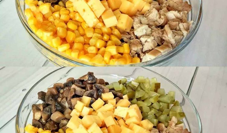 Відварене м’ясо, твердий сир та мариновані огірки нарізаю квадратиками. Всипаю консервовану кукурудзу.