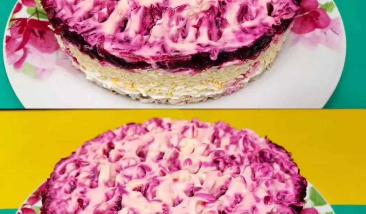 Натираю на терці варений буряк Змішую в окремій мисці видавлений часник з майонезом. Покриваю салат, смачного!