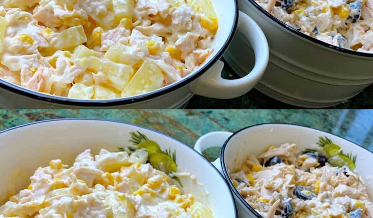 Курку та ананаси нарізаю дрібними кубиками. Всипаю кукурудзу, додаю сіль та майонез або сметану, замішую.