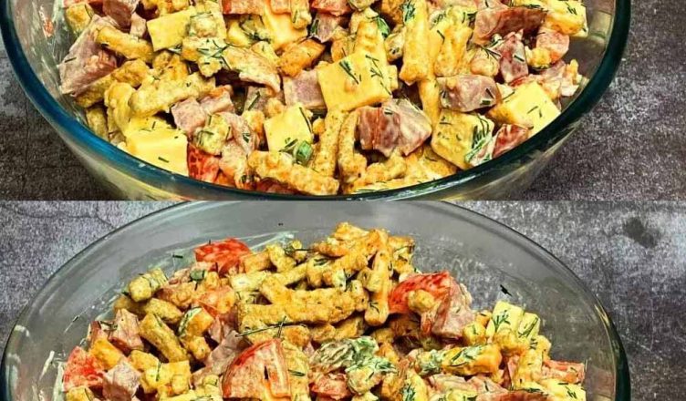 Покажу вам дуже смачненький салатик! Нічого складного – простий, яскравий та смачний салат із сухариками. Перед ним ніхто не встоїть!
